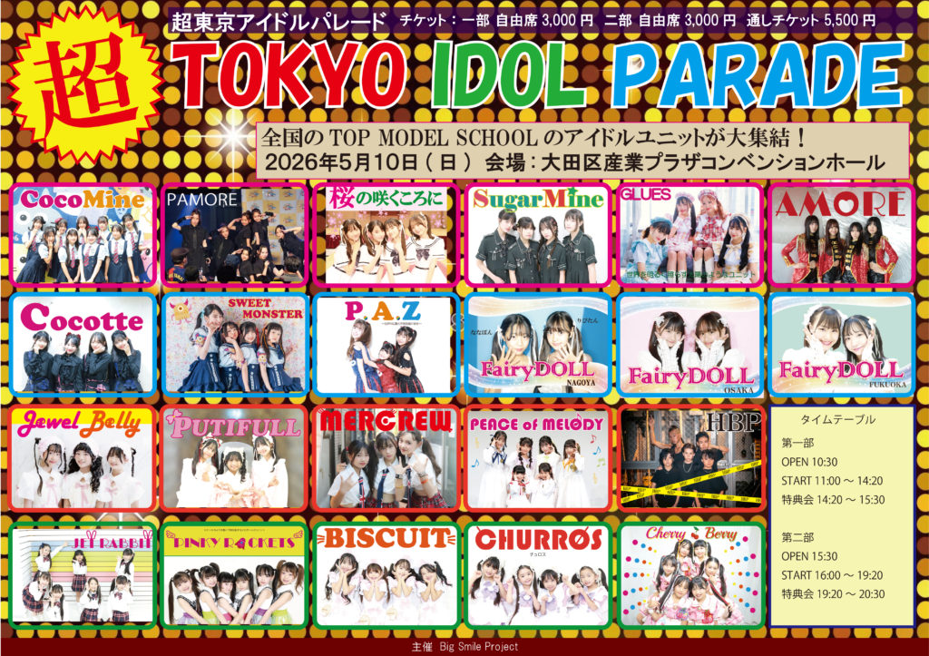 札幌・仙台・東京・名古屋・大阪・広島・福岡で展開中のTOP MODEL SCHOOLの合同アイドルイベント。 大田区産業プラザ コンベンションホールという大きな会場で、全国のアイドルユニットが一同に集結。
